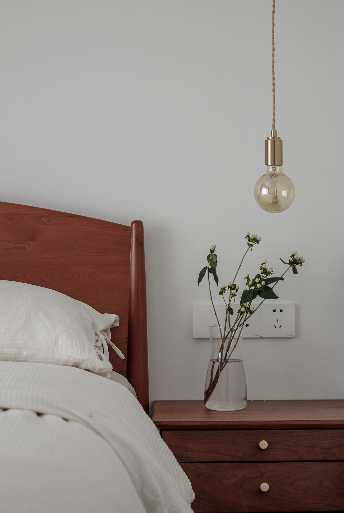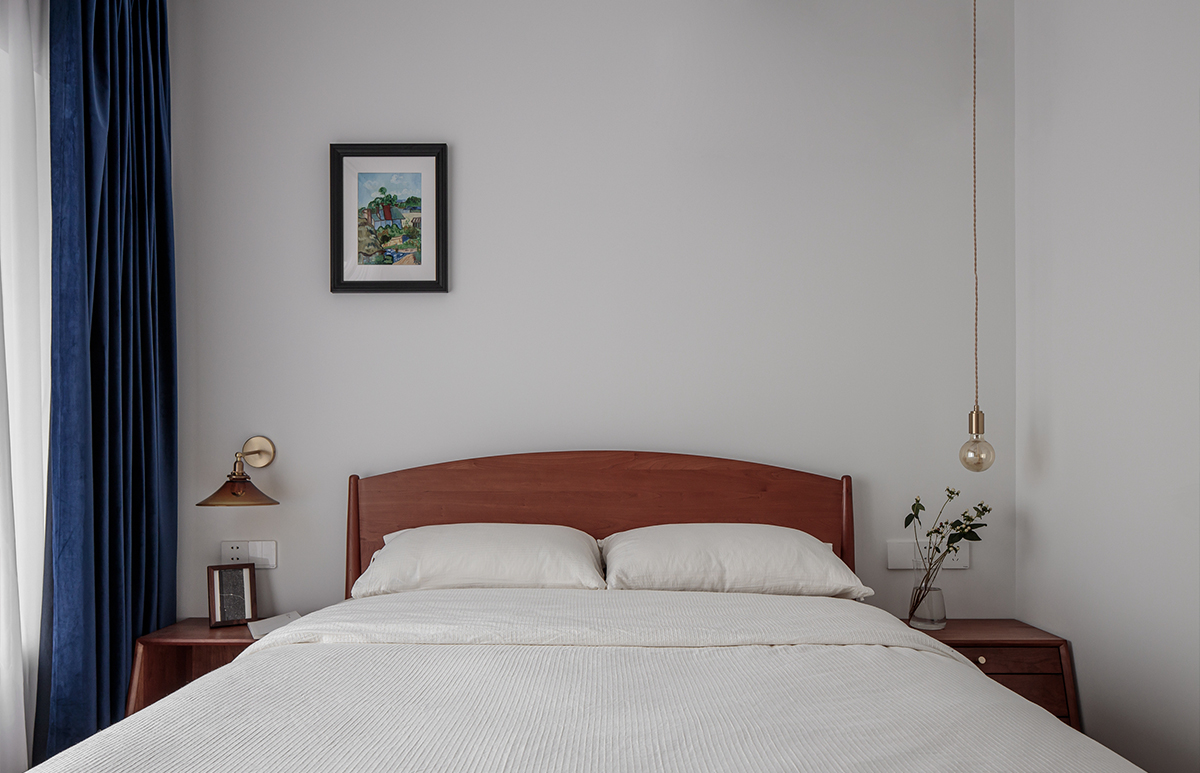 寢室的作用是舒適與放松身心,保持衣食住行的平衡是他們生活的日常態(tài)度。所以我們以櫻桃木為家具材質(zhì),減少傳統(tǒng)的儲(chǔ)物空間,在床下放置了滑輪箱用以放置平日的衣物,從精神與物質(zhì)上都達(dá)到一種平靜的感覺。