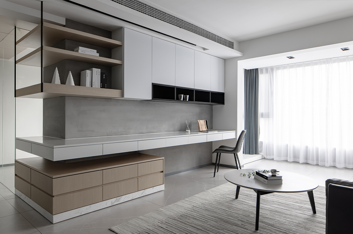 將書房搬進(jìn)客廳最大化滿足屋主的生活需求,加入木色提升空間溫度。無主燈的設(shè)計(jì)已經(jīng)成了主流,大大提高空間利用率。同時(shí)吊頂內(nèi)預(yù)留了投影幕布,忙碌的工作和沉重的學(xué)習(xí)之余可以看一場(chǎng)球賽亦或電影