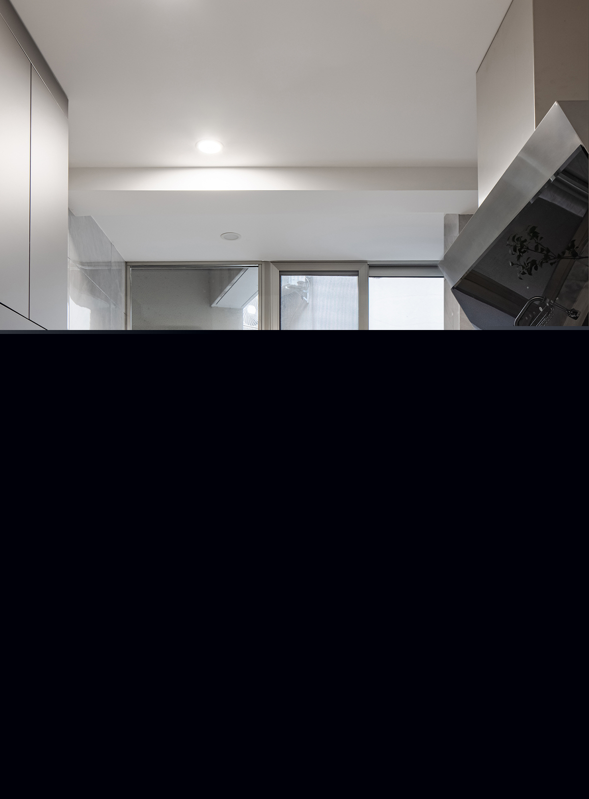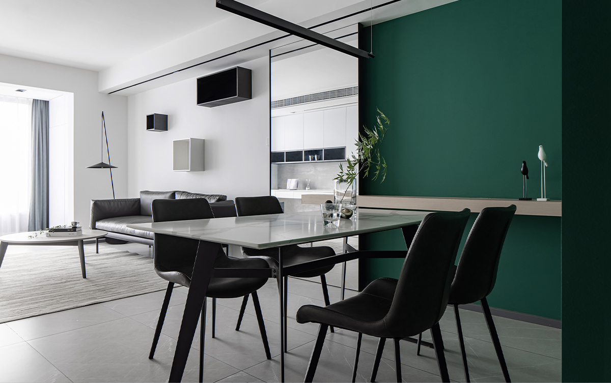 墨綠色是女主的心頭愛,希望可以加入新屋的設(shè)計(jì)當(dāng)中,但又不喧賓奪主。墨綠色的跳躍讓整體黑白灰木的基調(diào)看起來更加活潑和靈動(dòng),也延續(xù)了空間靜謐沉穩(wěn)的低調(diào)氣質(zhì)。既是造型又可以增加部分收納的原木色置物層板一端與墻體相連