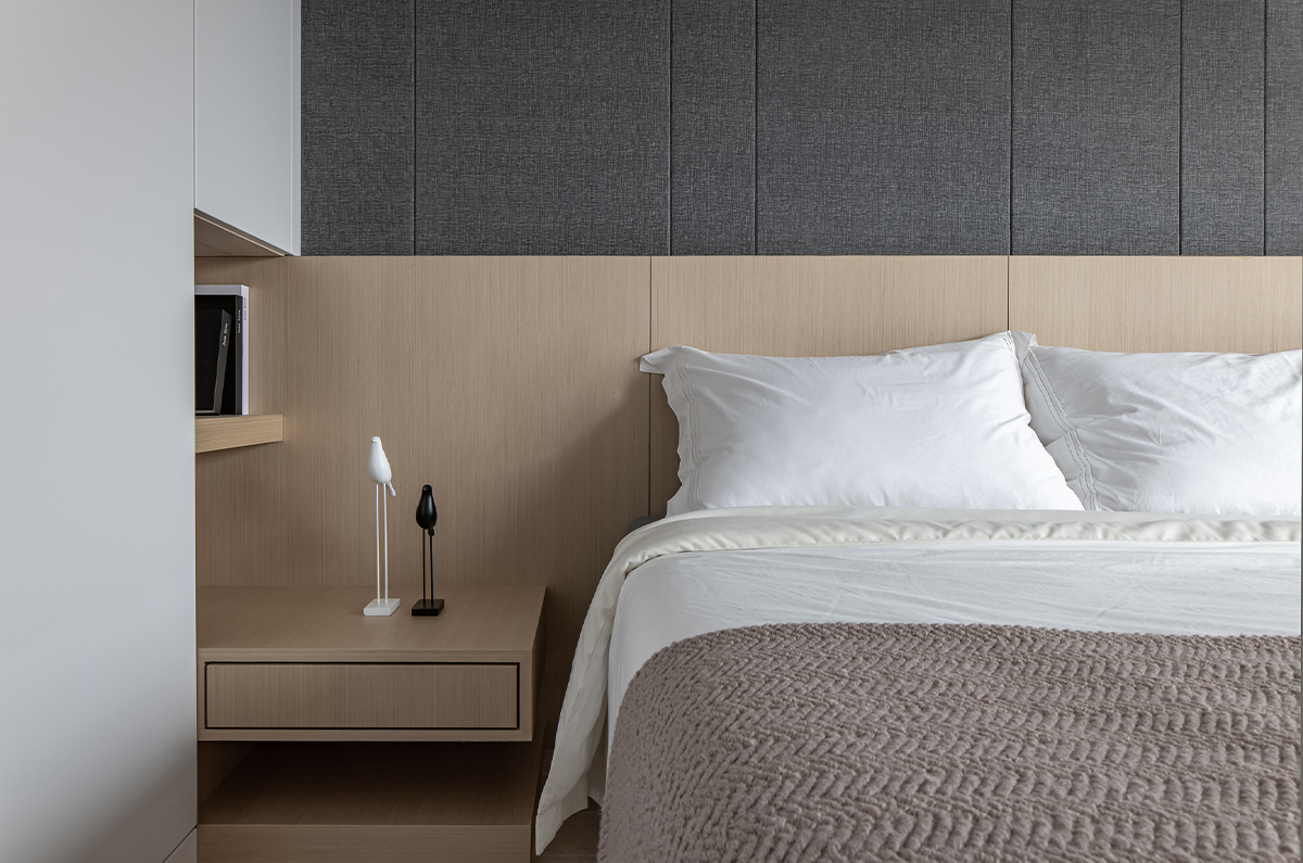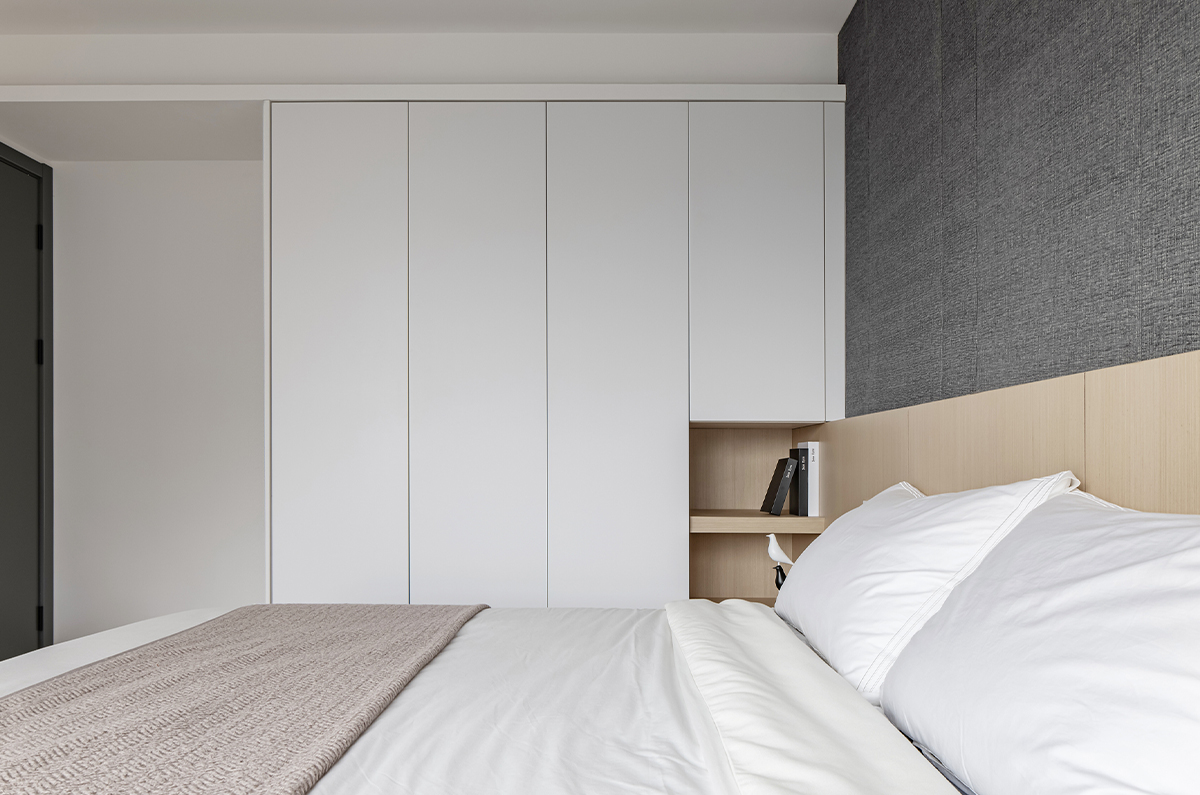 灰白木的基調(diào)展現(xiàn)自然淡泊的質(zhì)樸之美,營(yíng)造既高冷又溫馨的空間氛圍。貼合墻面無靠背的床頭設(shè)計(jì),用簡(jiǎn)約的硬包配合木飾面墻板做背景,空間看起來更加整潔更顯品質(zhì)。不同尺寸的比例分割形成簡(jiǎn)潔有力的線條裝飾,視覺傳達(dá)藝術(shù)體現(xiàn)有設(shè)計(jì)感的細(xì)節(jié)處理。