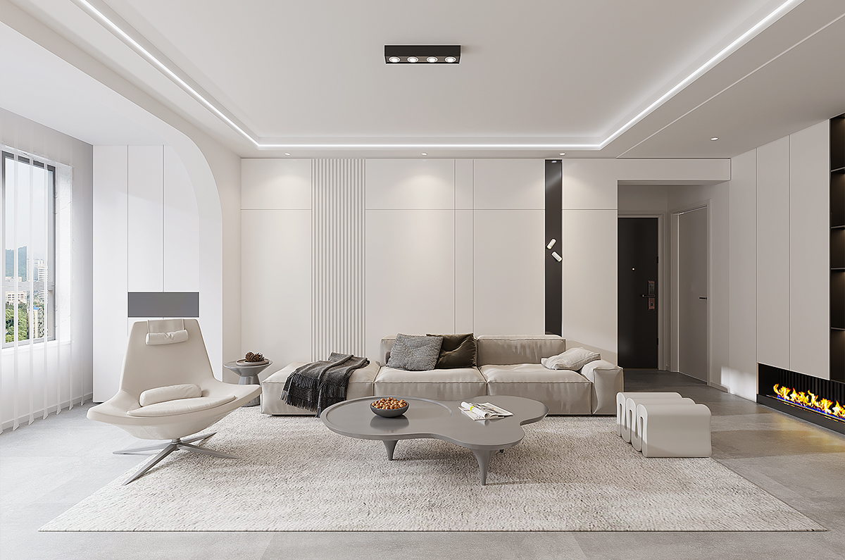 沙發(fā)背景墻整面用了木質(zhì)面板做裝飾,搭配上燈光,極簡的感覺尤為突出。