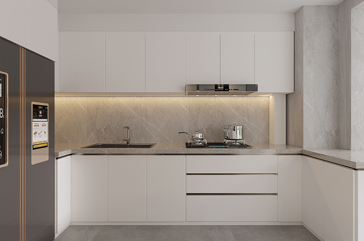 業(yè)主希望有足夠開闊的廚房,這個空間我選擇把墻體打掉,做開放式廚房。一組L型的櫥柜加上嵌入式的蒸烤箱和冰箱,讓廚房的空間看起來視野開闊,整潔明亮。