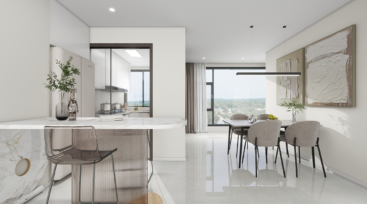 以簡潔明快的設(shè)計(jì)風(fēng)格為主調(diào),簡潔和實(shí)用是現(xiàn)代簡約風(fēng)格的基本特點(diǎn),餐廳背景墻上面還有打造的層次感突出的現(xiàn)代掛畫,加上柔和的燈光讓整體的空間沒有那么的單調(diào),餐廳多了一組島臺(tái)合理運(yùn)用了空間使空間并沒有那么空也沒有特別擁擠,為餐廳增添不一樣的氛圍。