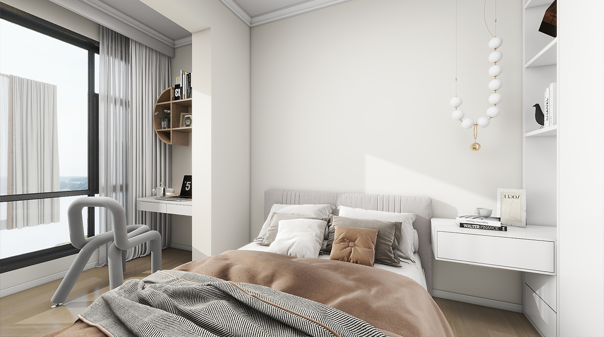 整個(gè)空間大氣又明朗,衣柜衍生出的床頭柜也是淺色為主,又具有一定的儲(chǔ)存功能,書桌位置吊柜做了一點(diǎn)調(diào)色柜子讓整個(gè)空間沒有那么單調(diào)更有層次。