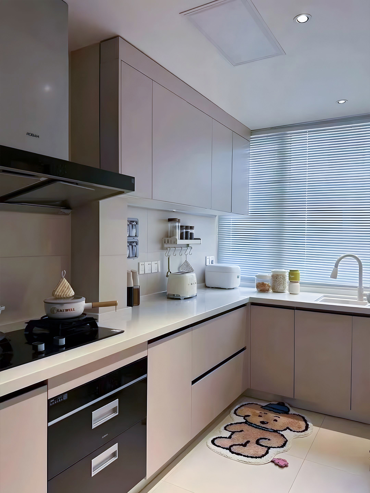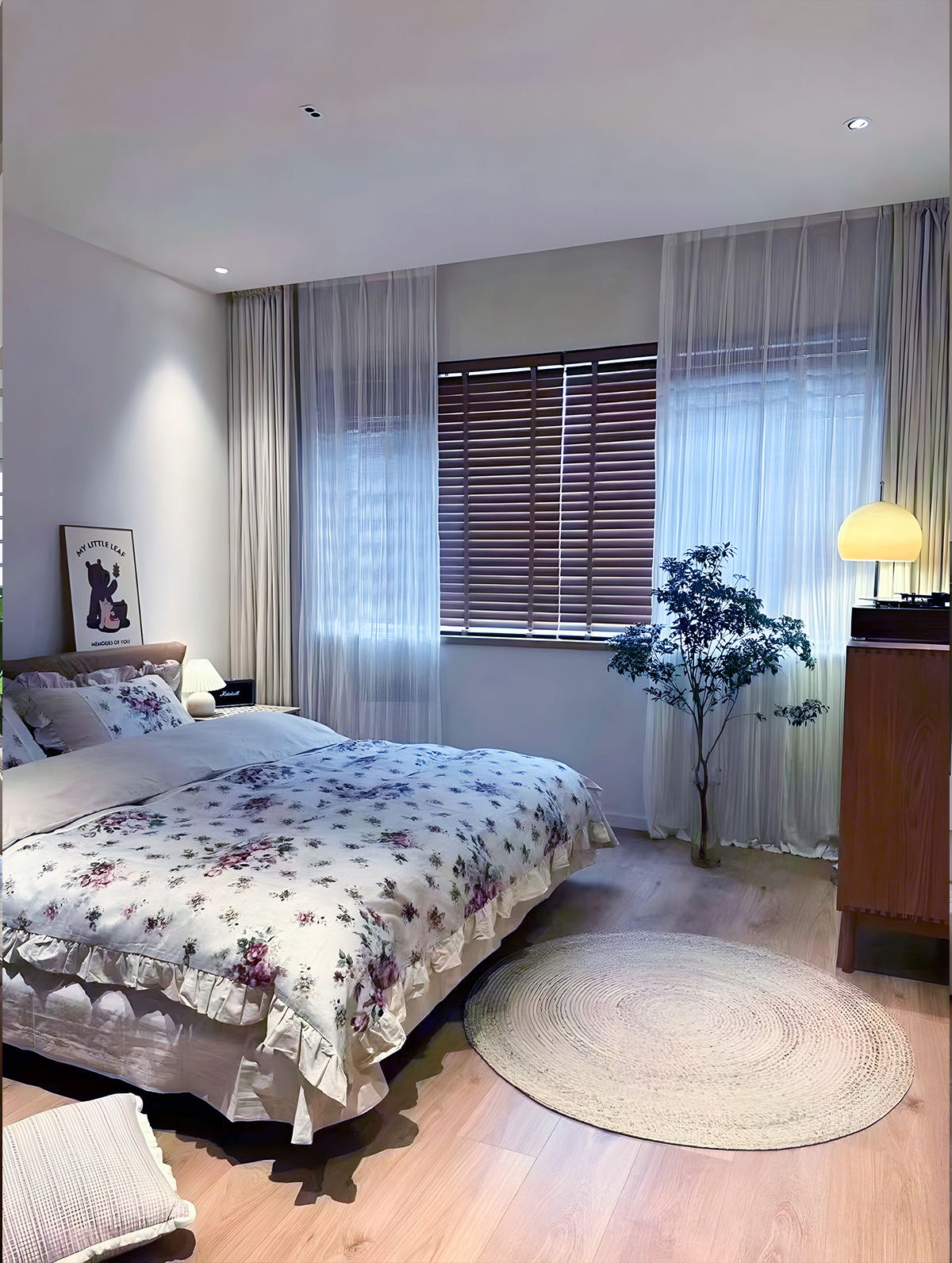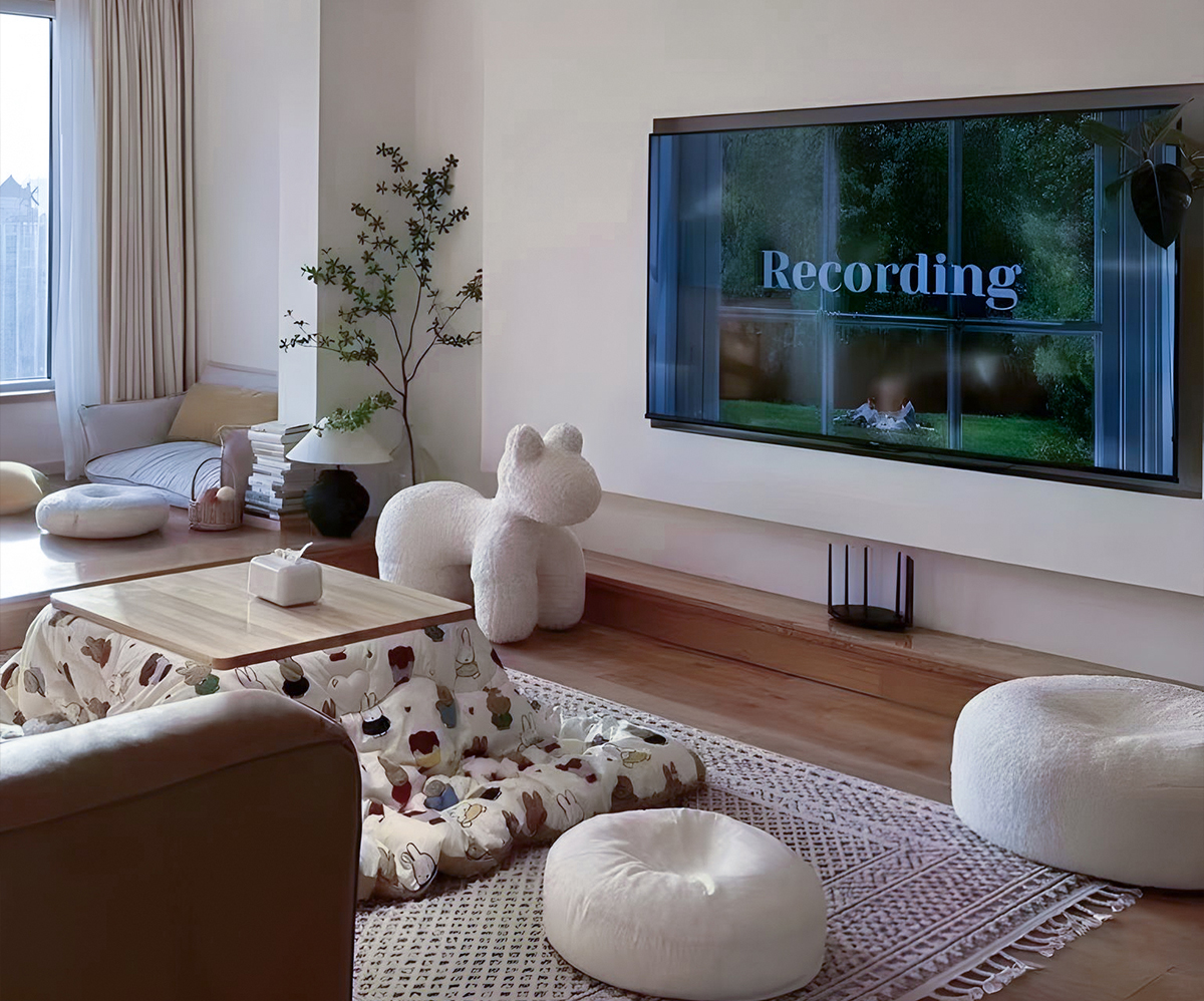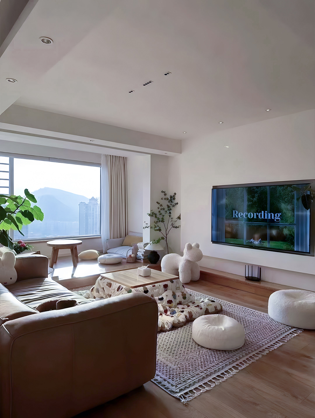 客廳以及餐廳在平行的視野里,模糊的邊界彼此作用相互借景,從地面到頂面再到墻面做了呼應(yīng)和連接,以及地面都是采用木地板,單配米黃色的墻面,使得整個空間更接近與自然,陽臺做一個地臺設(shè)計(jì),看書休息絕佳地