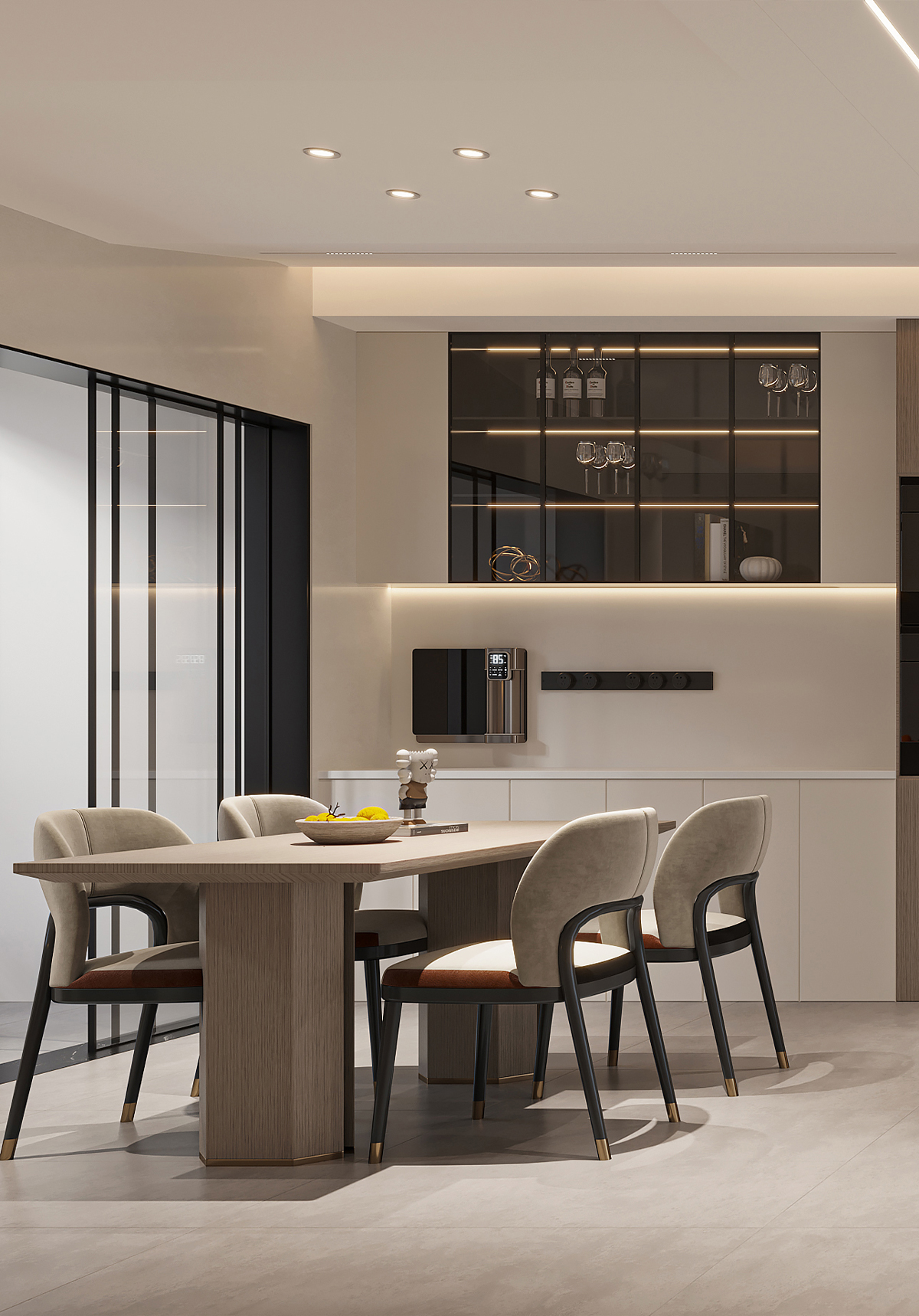餐廳和廚房做了餐廚一體化的設(shè)計,從不同的角度看整個空間帶給人的感官是不同的,但是又相得益彰,互相牽制,吊頂運(yùn)用了很多斜面來處理層高的問題。