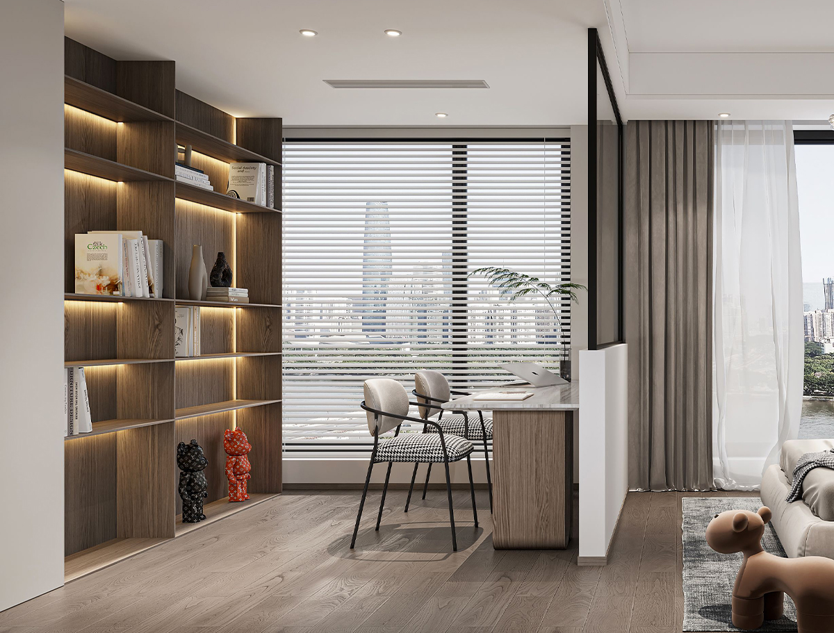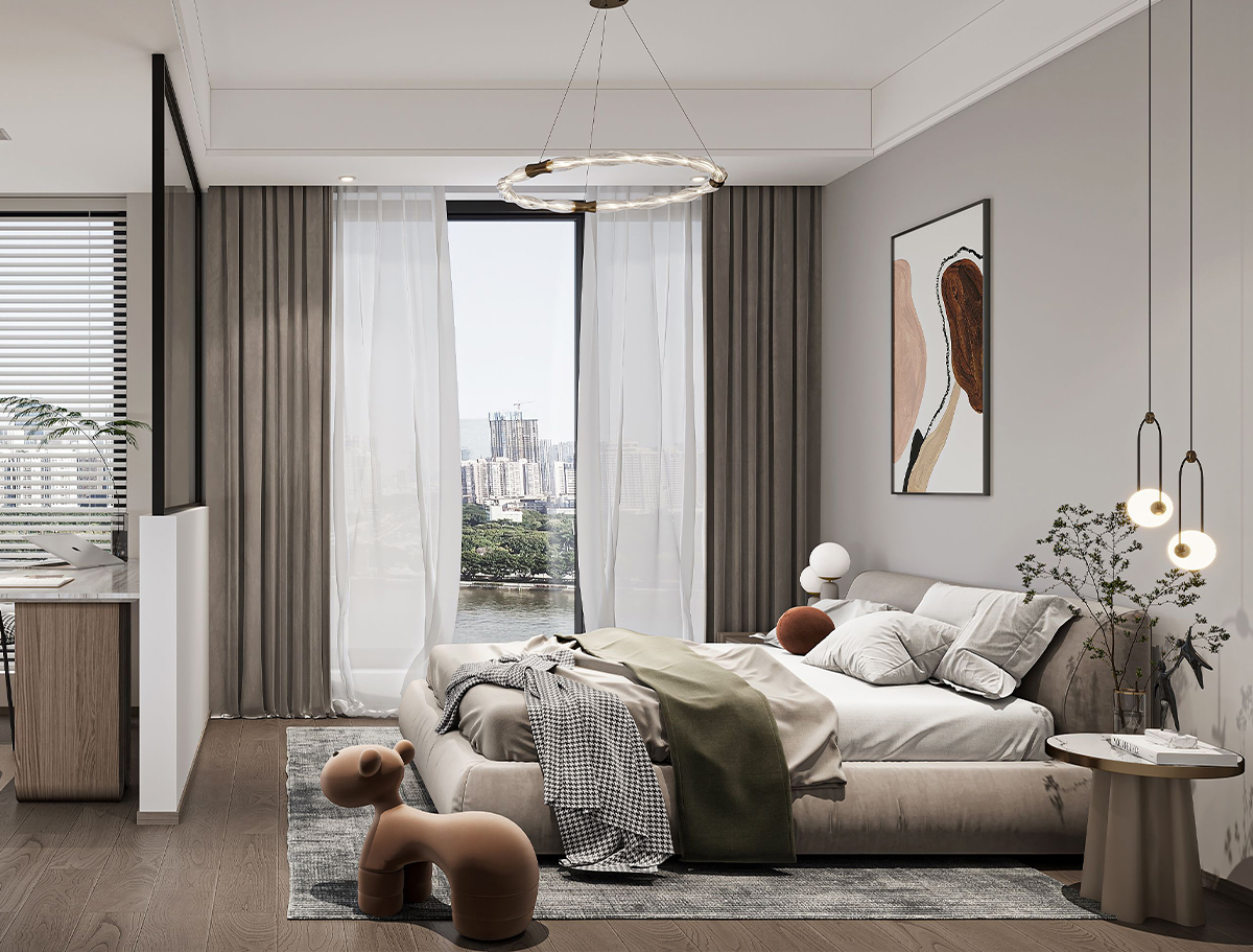 臥室和書房兩個房間連通到一起了,中間半墻隔斷做書房以及學(xué)習(xí)空間,整個空間做的更加成人化,簡約且做出更多的儲物以及活動空間。