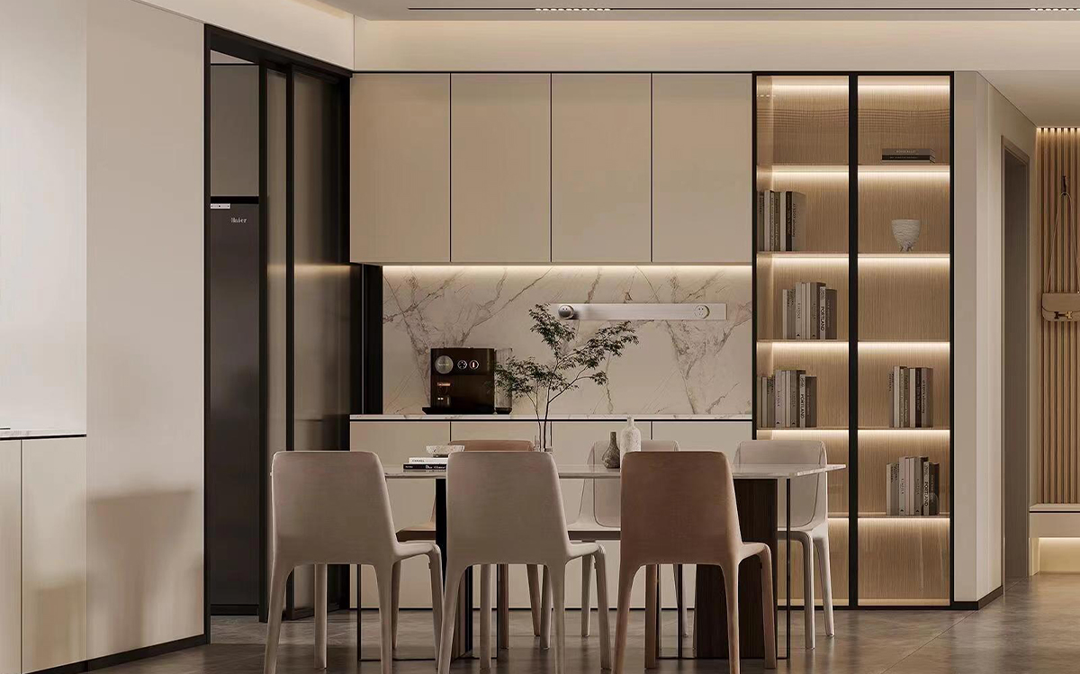 餐廳的整體色調(diào)和客廳相呼應(yīng),簡約餐邊柜搭配上無主燈的設(shè)計,強調(diào)空間的線條感,加上符合簡約理念的巖板餐桌,使得整體的空間簡約而不失大氣。