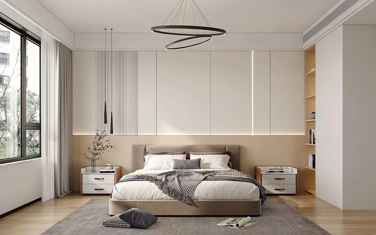 臥室整體色調(diào)采用淺米色,床頭柜、窗簾等一系列都配合得天衣無縫,使整個空間和諧美觀統(tǒng)一。融入地板的木紋元素,簡潔流暢。衣柜采用無把手設(shè)計,線條干脆利落,整體立面整潔,是簡約風(fēng)裝修設(shè)計的不二之選,床頭背景墻嵌有線性燈帶,燈帶發(fā)出的燈光柔和不刺眼,配合主燈進(jìn)行日常照明的同時極大地提升空間的時尚度與設(shè)計感。