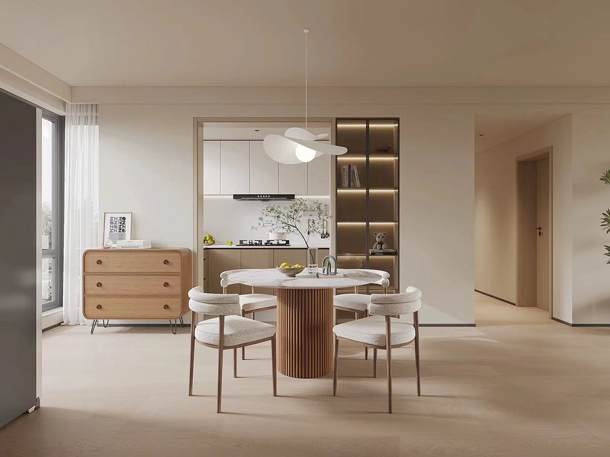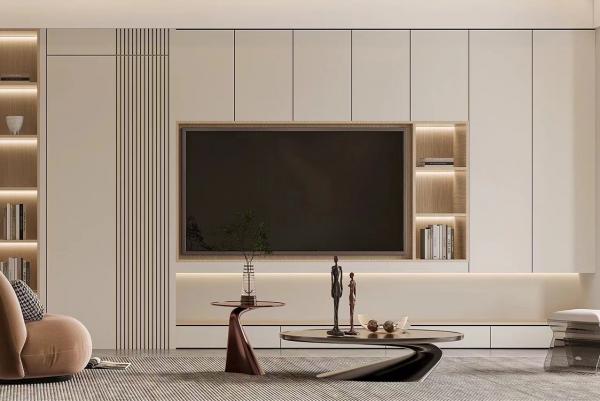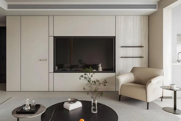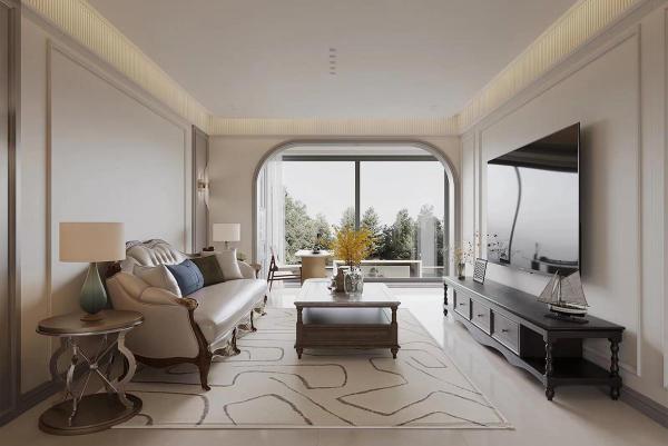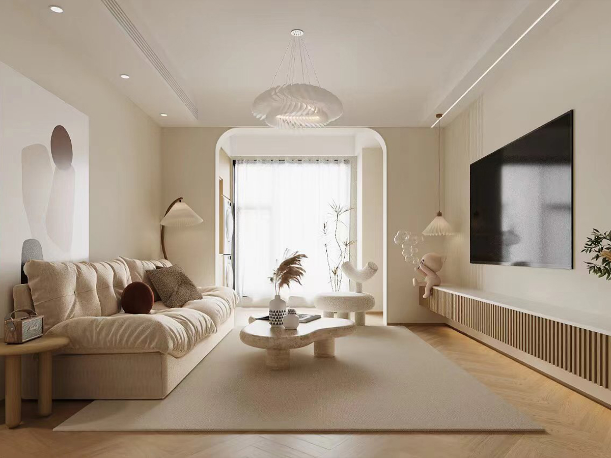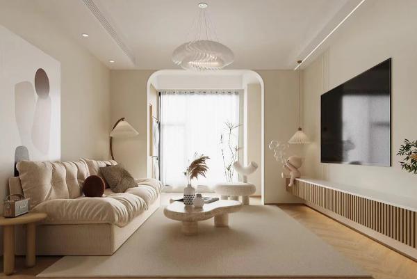 空間奶油風(fēng)+柔光磚不算張揚(yáng)卻很溫馨,木質(zhì)、白色造型墻板,白色與木色相結(jié)合,凸顯出客廳的溫馨舒適感。