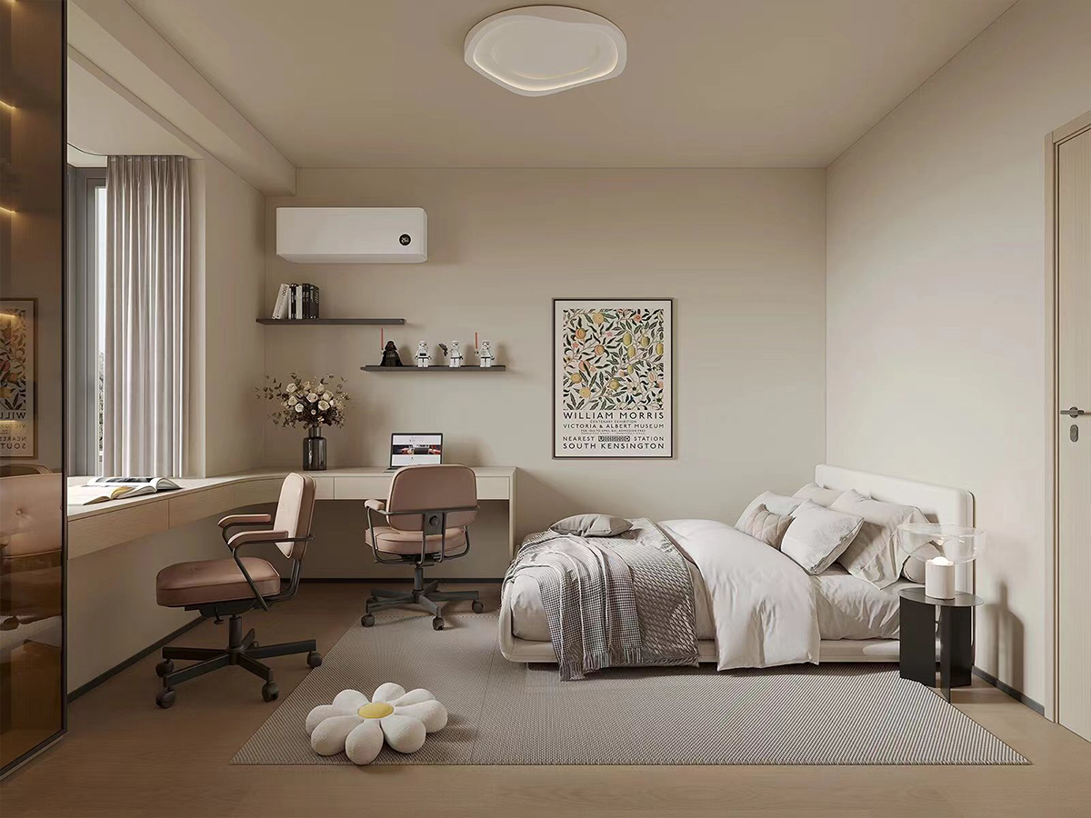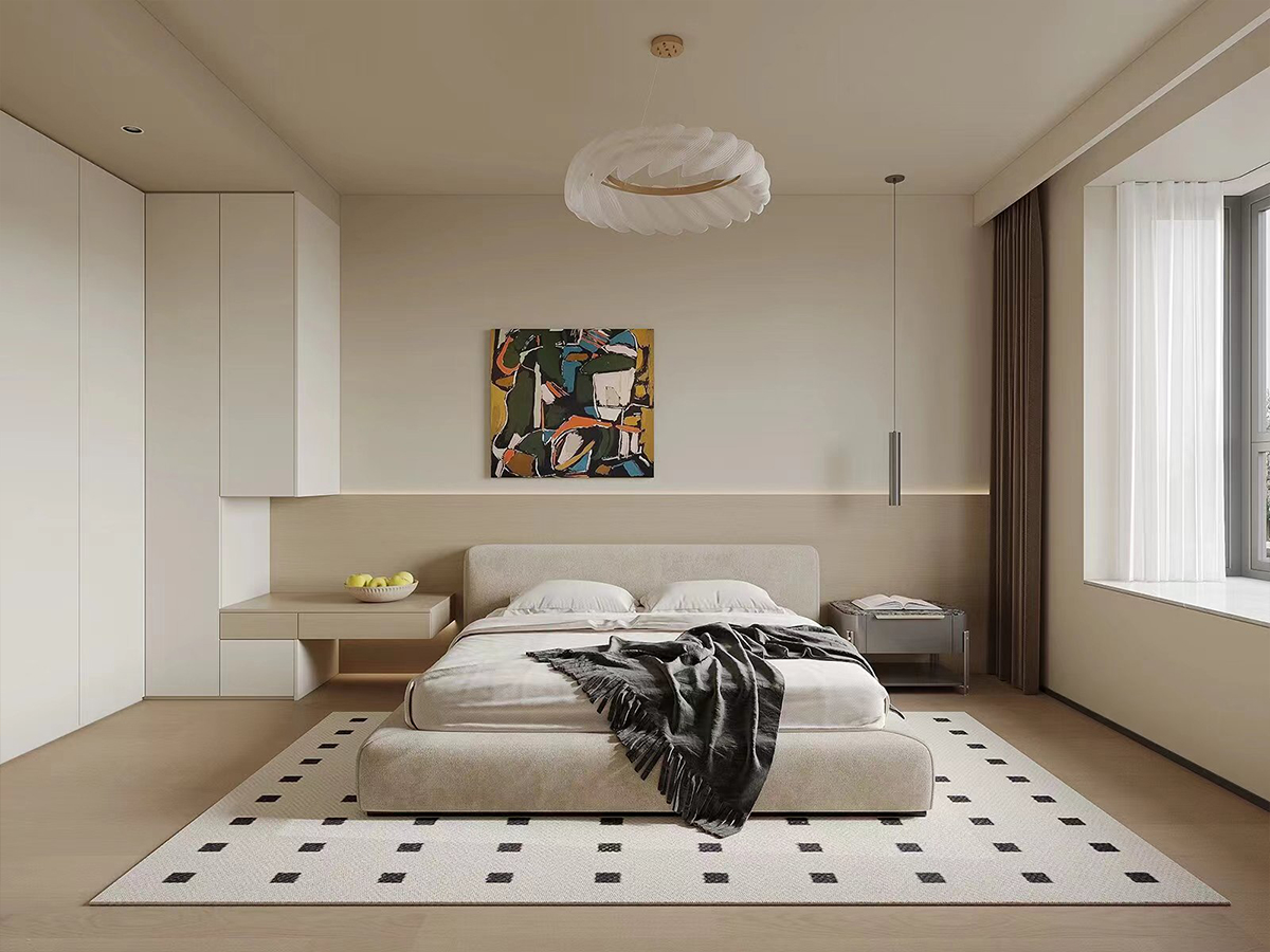 通過選擇奶油色床品以及原木色的床頭柜,結(jié)合墻面乳膠漆和窗簾,整體打造出輕松愉悅的氛圍。