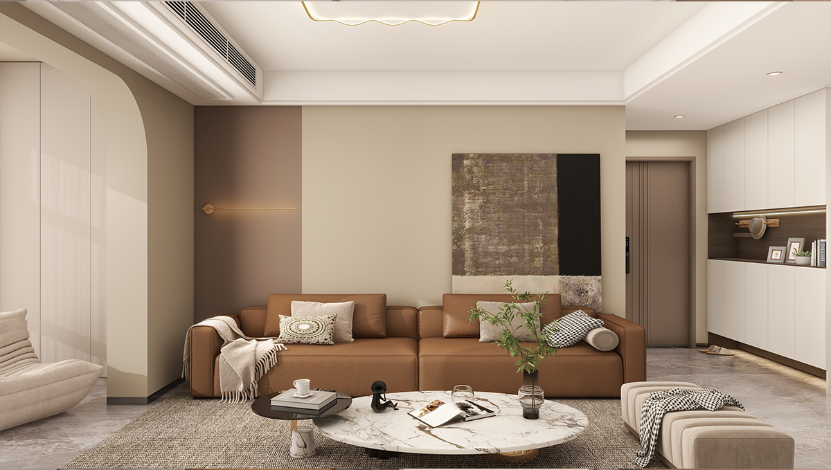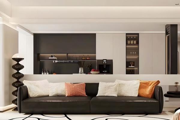 整個空間的墻面整體采用了咖色系的墻漆,客廳沙發(fā)背景墻用掛畫裝飾,吊頂采用邊吊的方式,簡潔的直線讓整個空間顯得大氣、整潔,通向陽臺的通道做了曲線設(shè)計的門洞,不顯硬朗的線條,可以為空間注入溫度,柔化空間,增加設(shè)計感;皮質(zhì)的沙發(fā)與布藝矮凳搭配更顯質(zhì)感,富有藝術(shù)感的茶幾和燈具修飾,整潔而不失格調(diào);在整體空間的基礎(chǔ)上合理運(yùn)用了黑白灰三色等軟裝,為這個家增添了舒服輕松的氛圍。