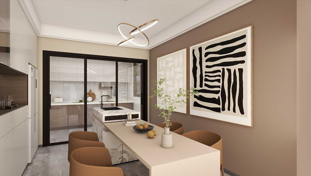 餐廳看上去通透明亮,四人的咖色長桌加上島臺更顯高級感搭配淺棕色的餐椅,四推拉的廚房門使空間更顯通透,恰到好處的擺件與黑白灰的掛畫點(diǎn)綴增添活力,既滿足了人數(shù)的需求,更增添了溫馨、柔美的空間氛圍;餐邊柜簡潔大氣,縷空設(shè)計可以進(jìn)行物品展示,具有儲物、展示的功能。