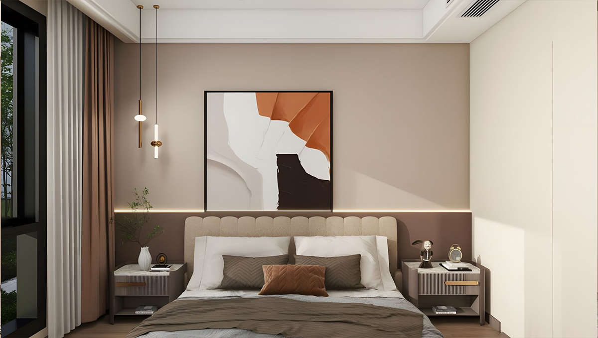 主臥簡約治愈,整體風(fēng)格溫馨舒適。主臥使用深棕色的木地板更顯溫馨,定制衣柜門將衣帽間隱藏,既節(jié)省空間又能滿足日常儲放功能;背景墻墻漆與其他墻體顏色進(jìn)行區(qū)分加上燈帶增添氛圍感,再用掛畫配上精致的小吊燈渲染溫暖高級的氛圍;透光的白紗窗簾與奶咖色的遮光簾。