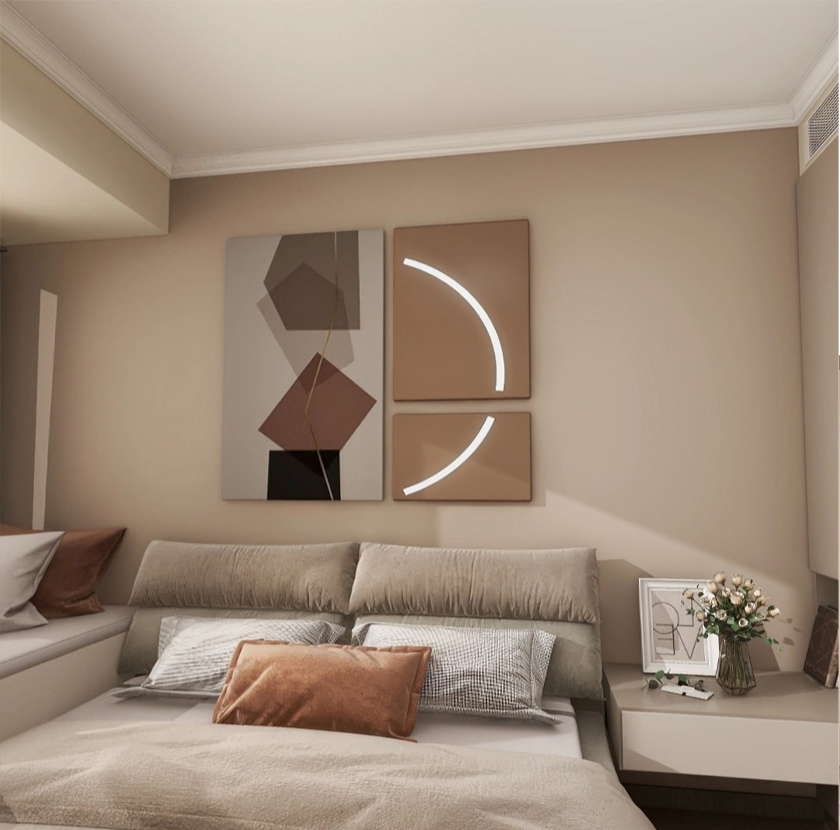 次臥室與主臥室的風(fēng)格相互呼應(yīng),溫馨舒適。以簡約、實用和時尚為主要特點(diǎn),旨在為居住者打造一個舒適、寧靜的休息空間。在空間布局上,次臥追求簡潔明快的線條,強(qiáng)調(diào)空間的通透感。床上用品選擇以奶咖搭配棕色的顏色,不會破壞整體的風(fēng)格,還顯得自然;從衣柜延伸出來的跳板充分利用了有限的空間,不僅可以儲物還能當(dāng)做床頭柜使用,懸空設(shè)計更顯美觀簡潔,空間不會顯得沉悶,還更加的溫馨舒服。