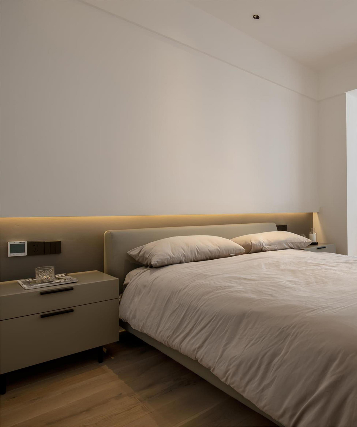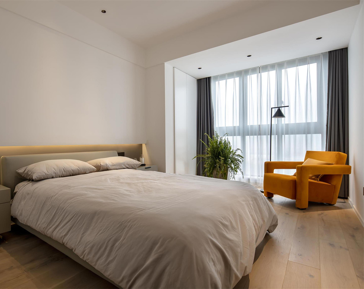 在臥室中,采用柔和而中性的色彩,如米白色、灰色以及淡藍(lán)色。這些顏色能夠?yàn)榕P室營(yíng)造出一種寧?kù)o而放松的氛圍。同時(shí),選擇原木色地板,并搭配中性色的床品和窗簾,營(yíng)造出一個(gè)宜人的睡眠空間。