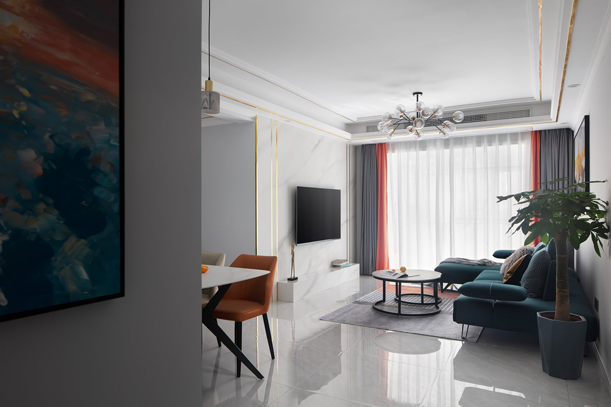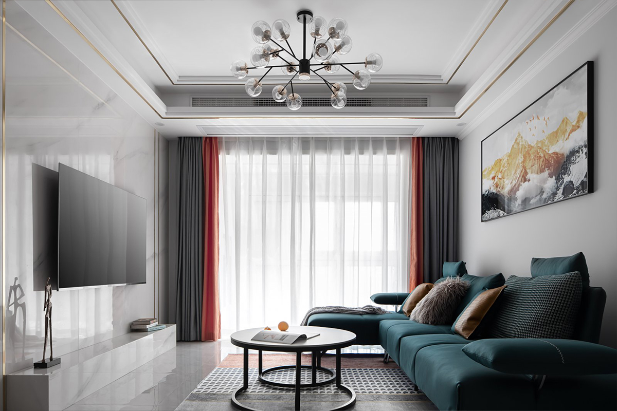 為了使空間利用最大化,裝修可以選擇搭配落地玻璃窗讓空間更加明亮寬敞,并且采光效果也很好,客廳家具采用灰色調(diào)搭配金屬線條元素點(diǎn)綴,營造出沉穩(wěn)不失時(shí)尚的氛圍。