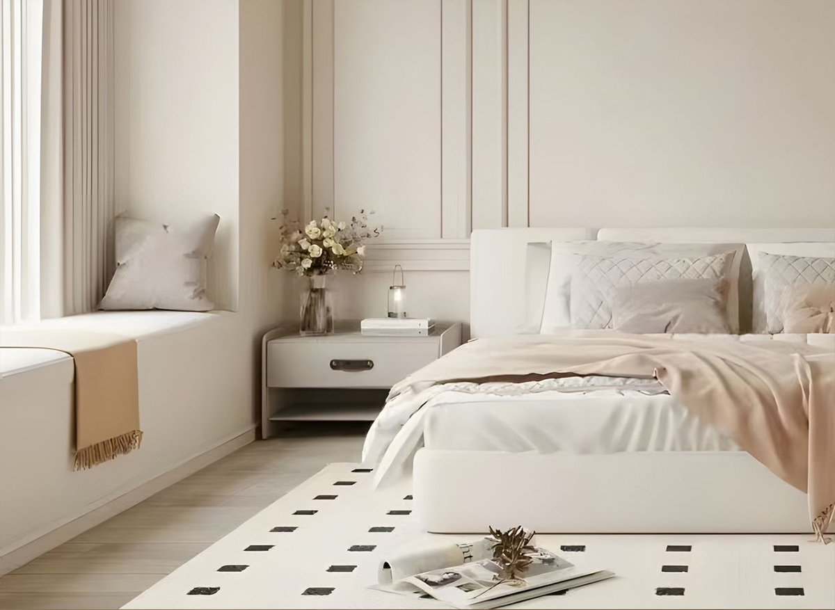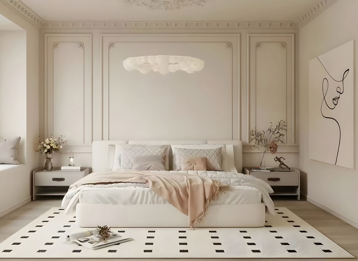 臥室的主色調(diào)為奶油色撞棕咖色。床頭吊燈,溫馨治愈,柔和的燈光營造溫暖氛圍。墻面做法式pu線條雕花處理,高級感滿滿。黑白格紋地毯點綴地面,成為整個空間的點睛之筆