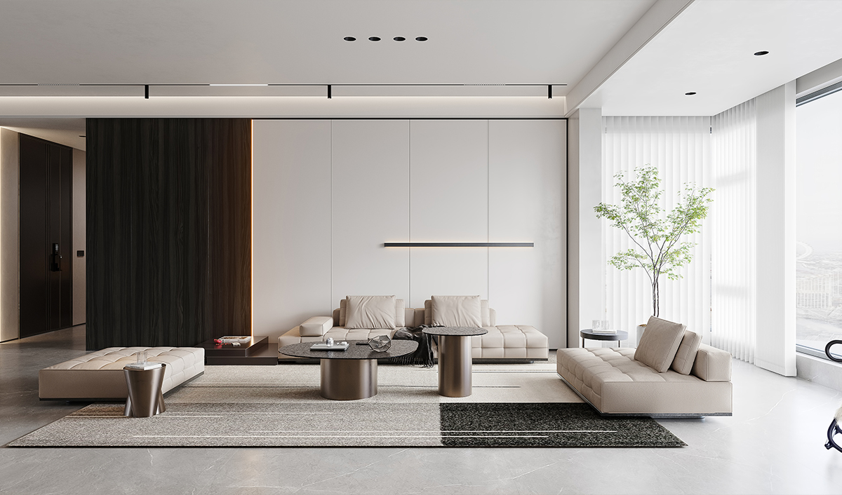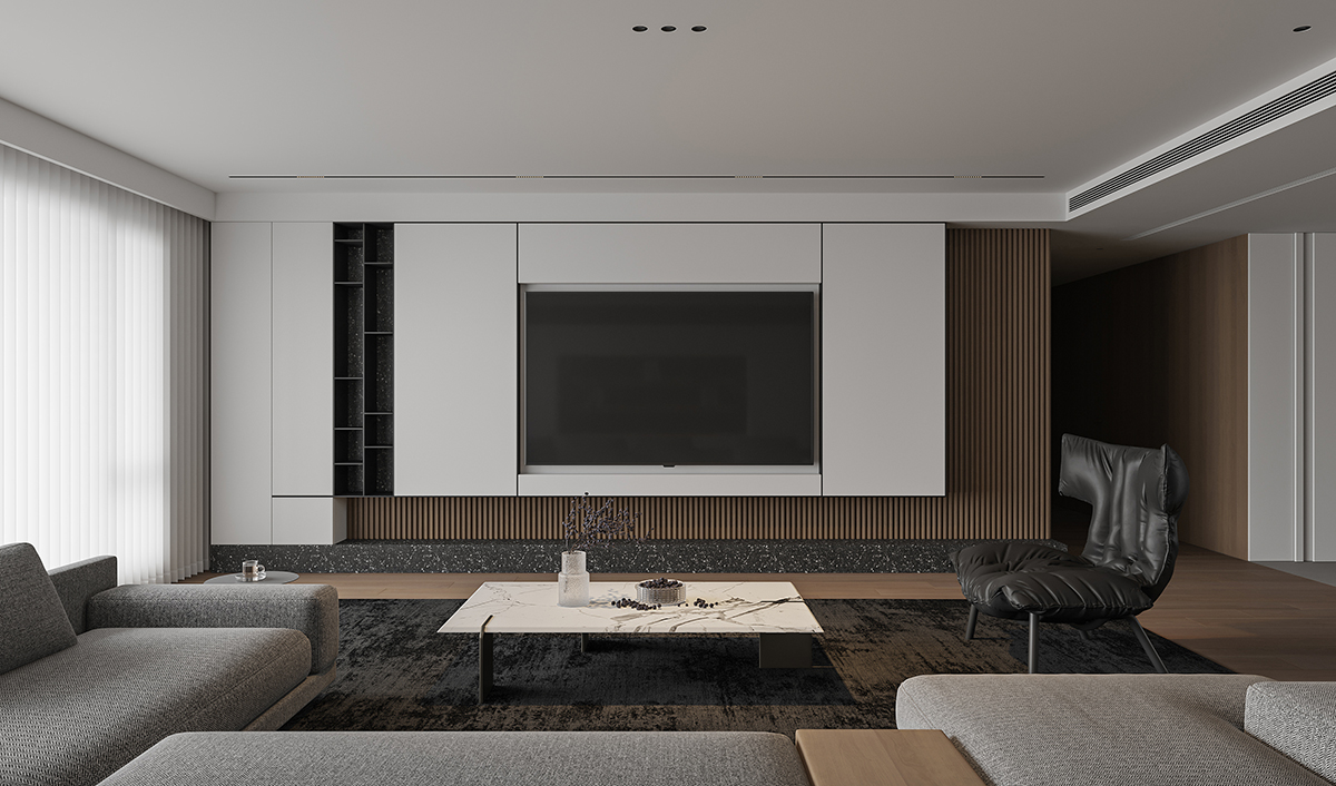 客廳的第一視覺便是寬闊感,空間的舒適度最大化的利用。大大的落地窗,透光的白紗窗簾搭配奶白色遮光簾,拉開可以欣賞美景,拉上又可以舒舒服服的休息。