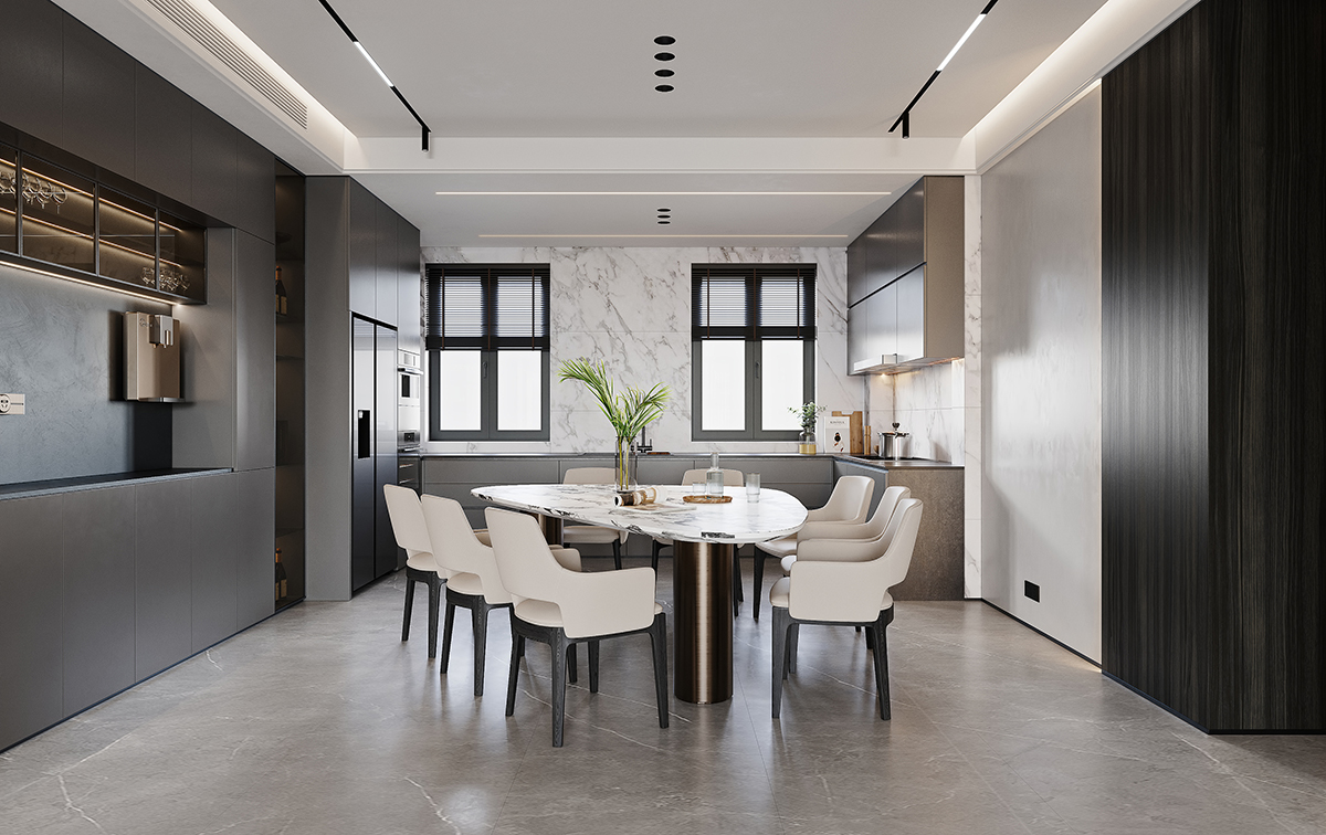 大大的餐邊柜既可以展示又能儲物,可以最大化的利用空間,強調(diào)就餐儀式的同時,也將入戶和客餐廳動線分為兩個回字形。呼應(yīng)了整體的主題色調(diào),極具設(shè)計感。