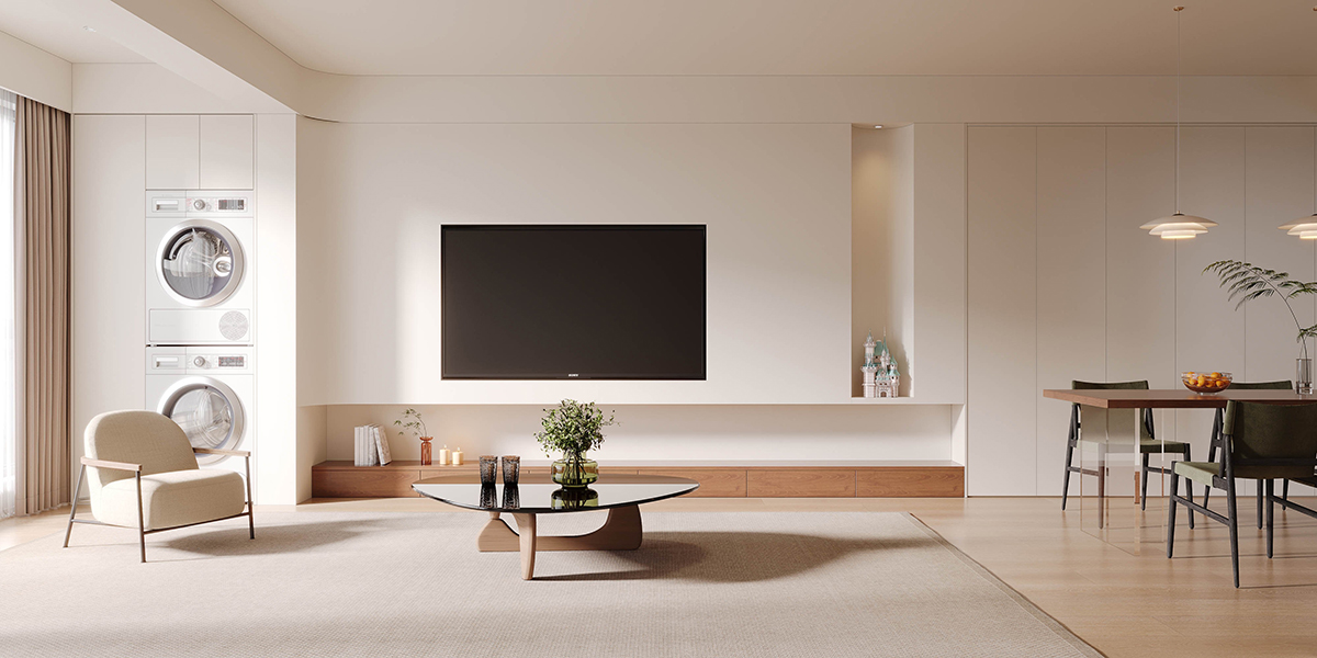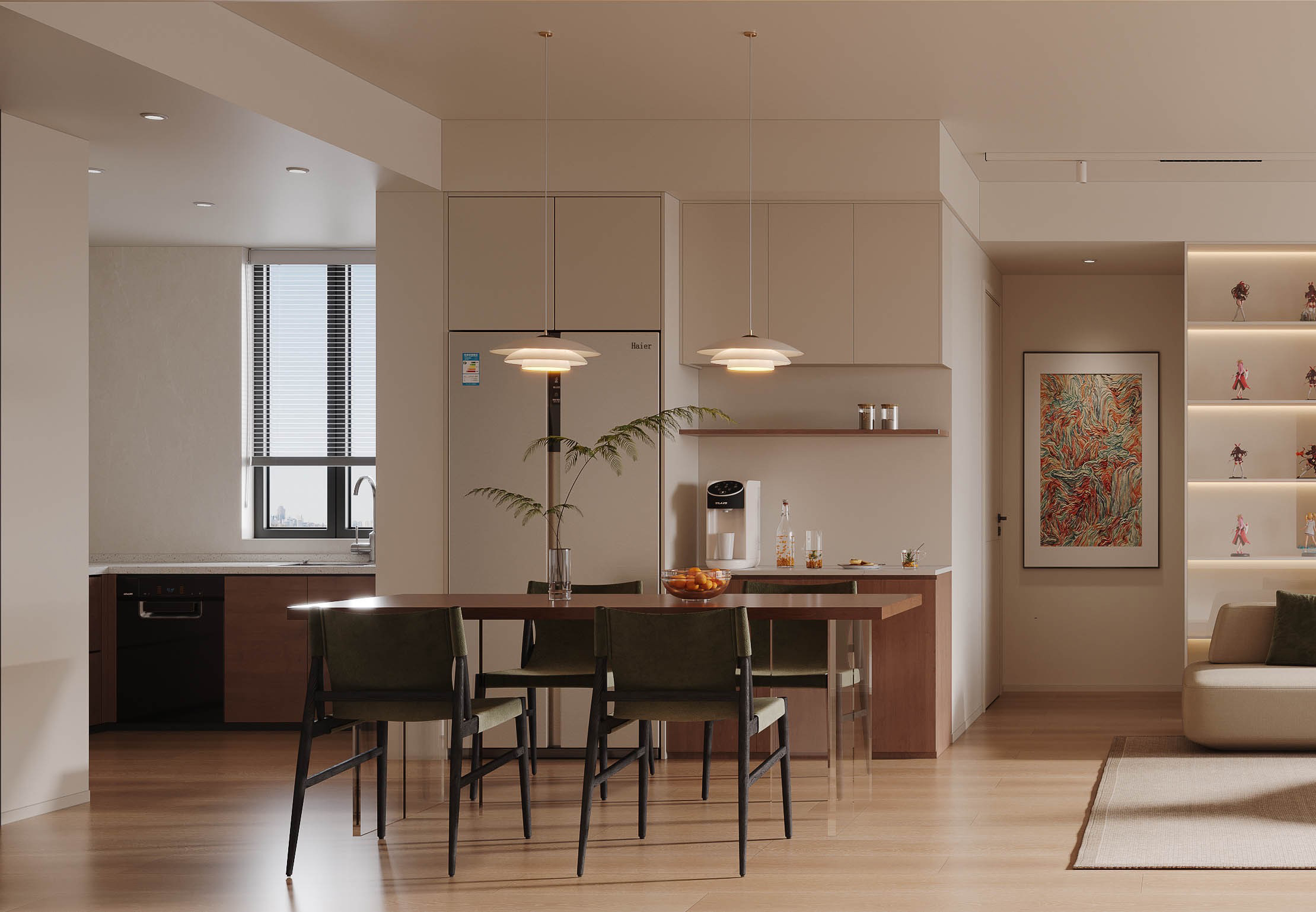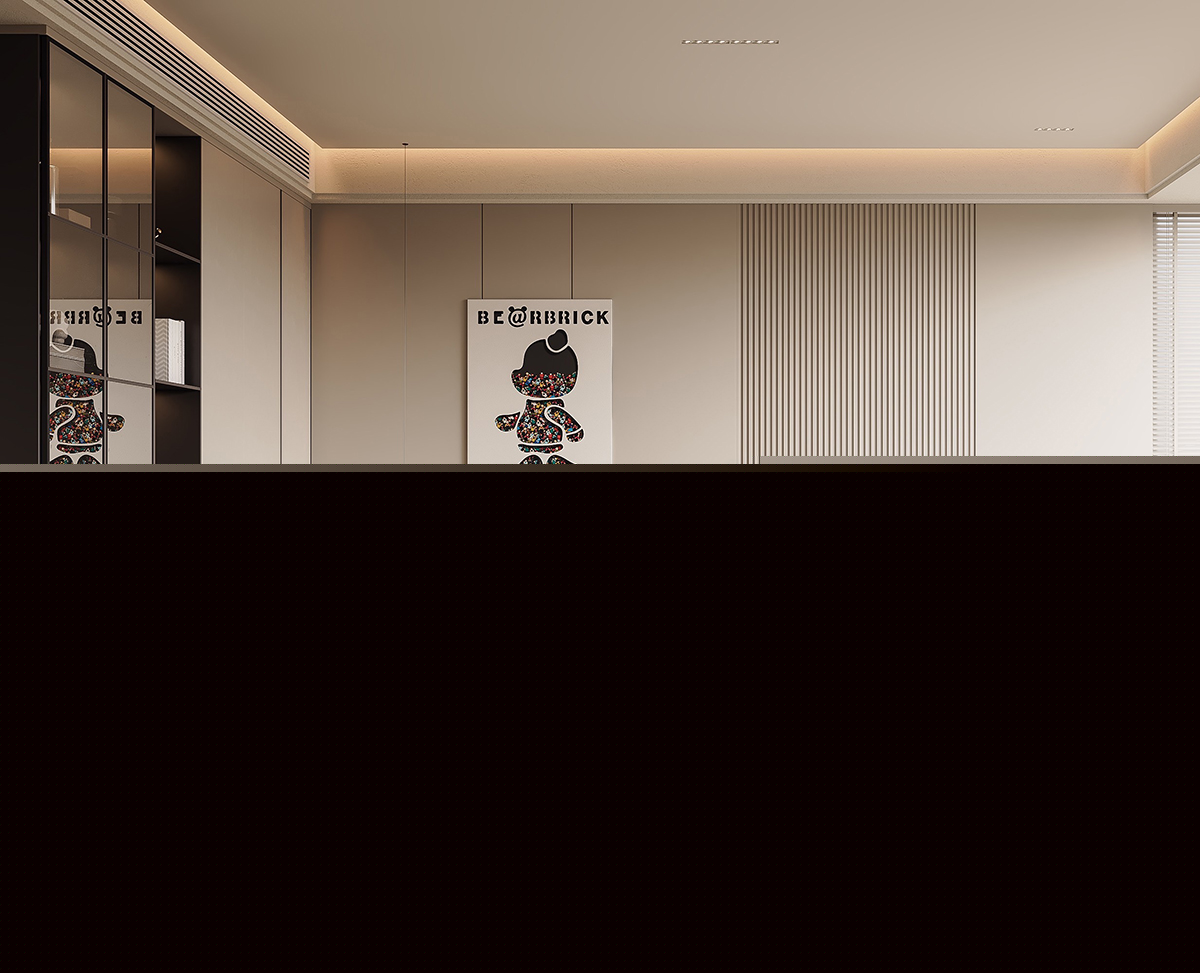 客廳以及餐廳在平行的視野里,模糊的邊界彼此作用相互借景,從地面到頂面再到墻面做了呼應(yīng)和連接,打開玻璃滑門就是一個(gè)整體,視覺和面積上大大拓展了客廳空間感。