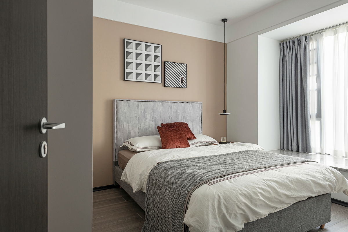 次臥父母或朋友前來小住,米褐色與焦糖橙搭配大象灰,整個(gè)空間氛圍優(yōu)雅溫潤,建立出當(dāng)代藝術(shù)感與生活相融合的和諧關(guān)系。