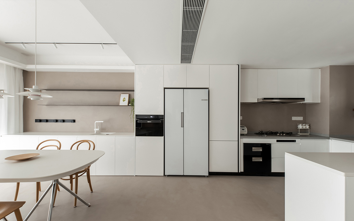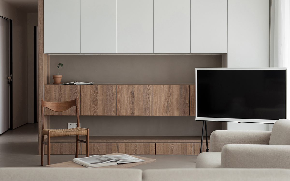 客廳以簡潔干凈的線條為主,內嵌的電視柜、無主燈設計,在視覺上擴大空間效果,凸顯整體質感。粗獷天然的柚木木皮在整體細膩材料中形成了強烈對比,公共區(qū)地面用微水泥覆蓋原有的瓷磚,溫暖的選色讓水泥多了一份暖意,粗獷天然的柚木木皮在整體細膩材料中形成了強烈對比,在精致與粗糙的混搭之間,展現(xiàn)出一種充滿歲月感的寧靜氣息。