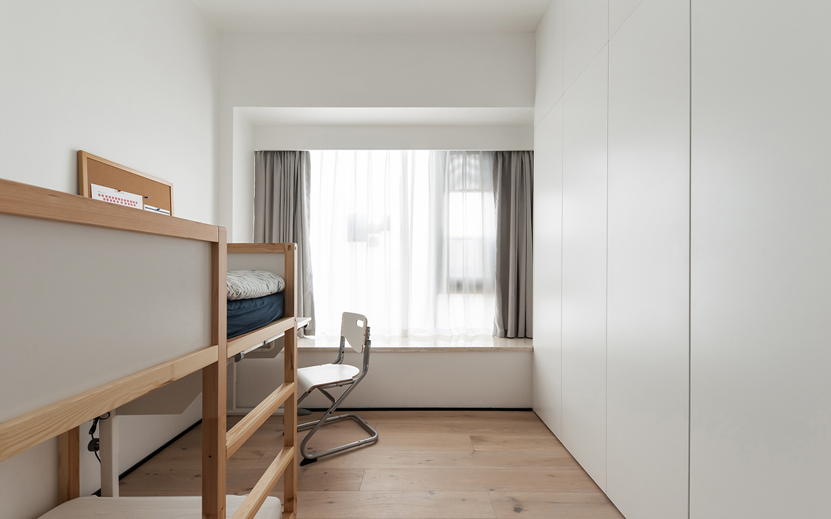 兒童房以簡約白色為主,放置了宜家的一款上下床,一層的床鋪直接靠地板,對孩子來說,它更加安全。