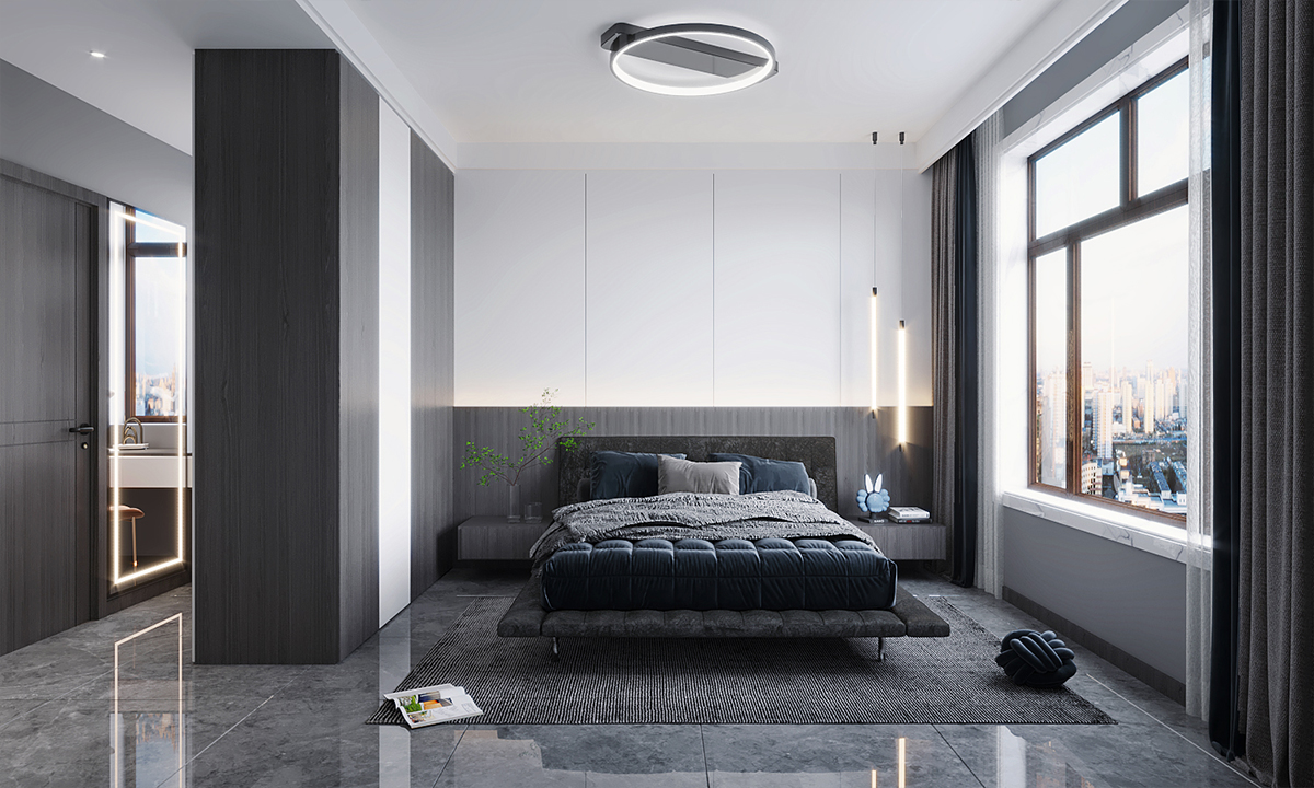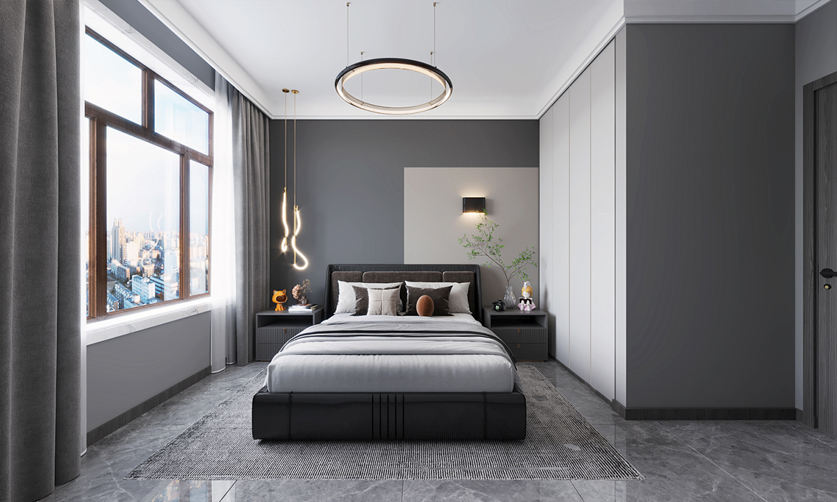 主臥和次臥都延續(xù)了客餐廳現(xiàn)代簡(jiǎn)約風(fēng)的設(shè)計(jì),布局設(shè)計(jì)要注重簡(jiǎn)潔和功能性。將床擺放在房間的中央或靠墻位置,家具選擇要追求簡(jiǎn)約的線條和現(xiàn)代感。選擇簡(jiǎn)潔而實(shí)用的床架,搭配舒適的床墊和床單,讓你享受美好的睡眠時(shí)光。